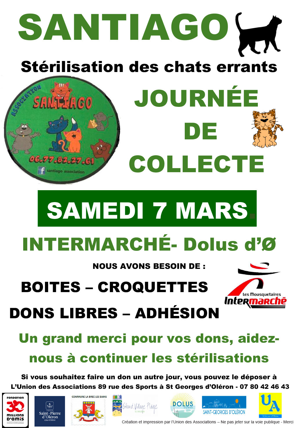 Si vous souhaitez faire un don un autre jour, vous pouvez le déposer à l’Union des Associations 89 rue des Sports à St-Georges d’Oléron – 07 80 42 46 43